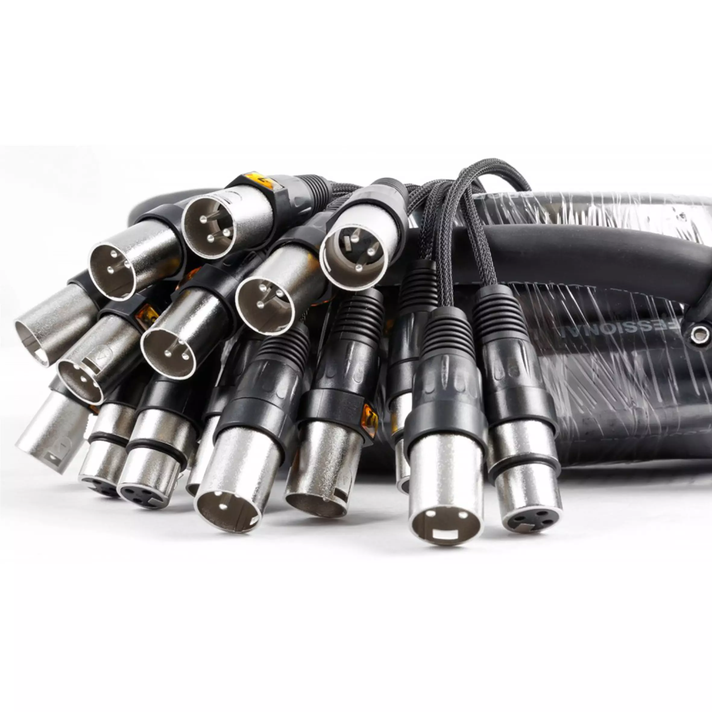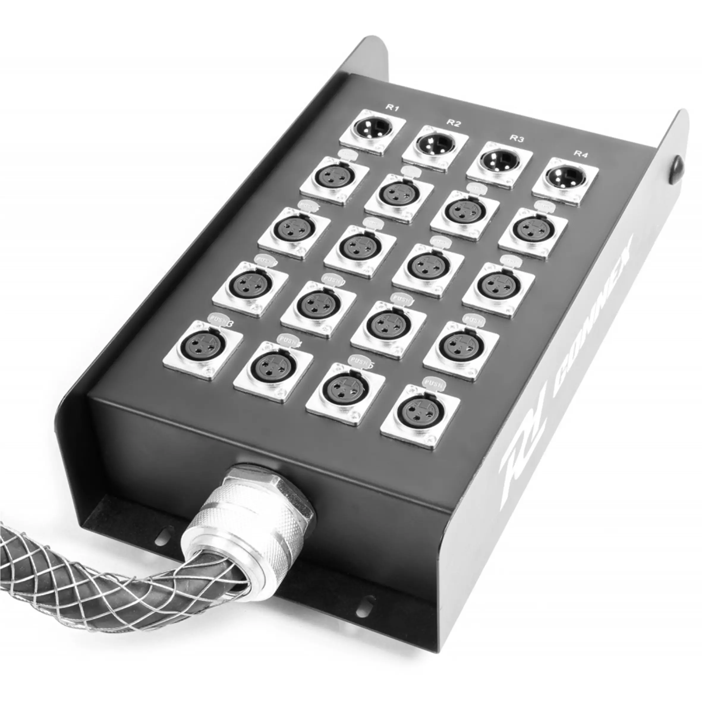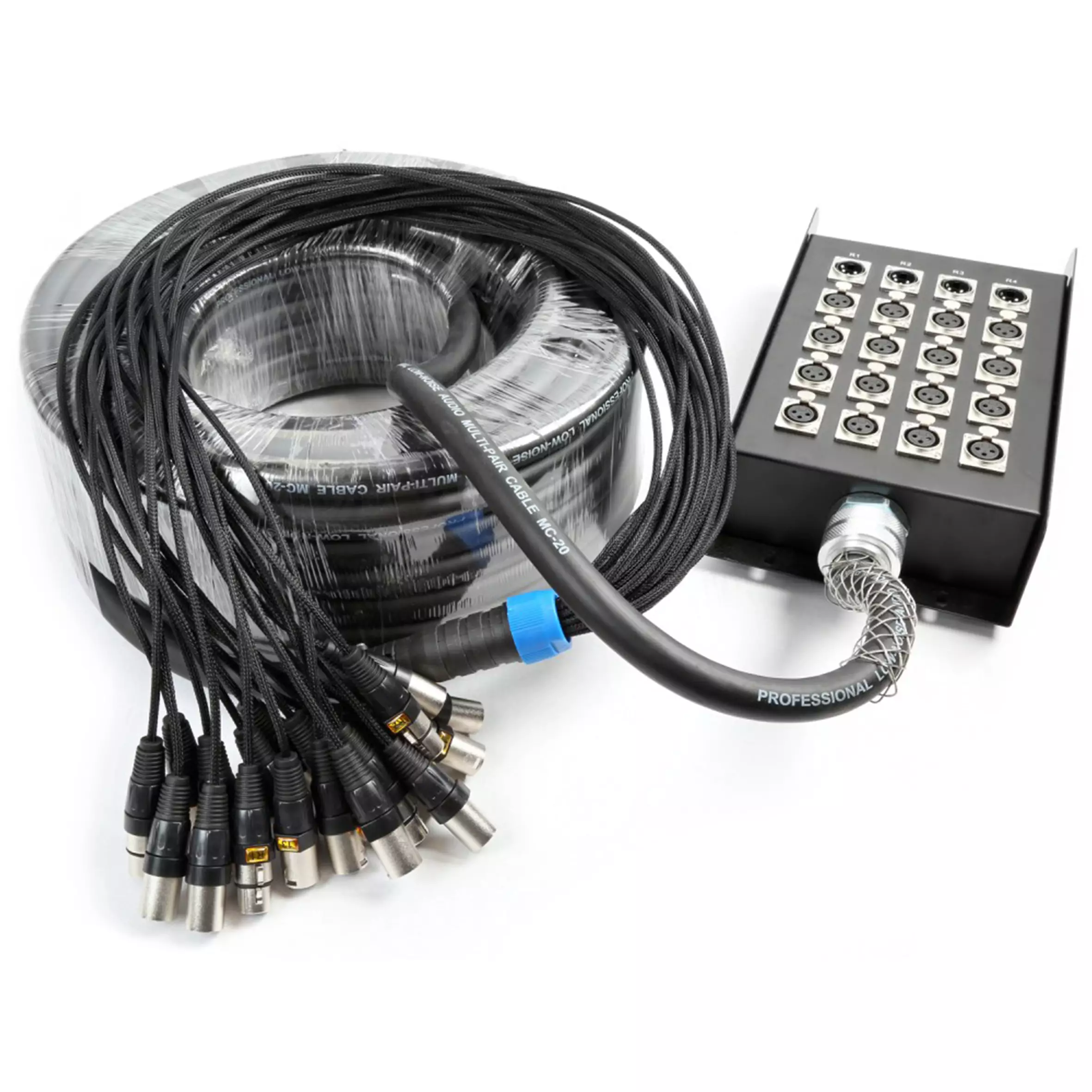 Stage Snake multi cable with a solid metal stagebox. The multi-cable has 16 inputs(female) and 4 outputs(male) on stagebox, allowing you to send microphone signals to the mixer and send out floor monitors back to the stage. The cable is 30 metres long and thanks to the high quality, you will able to enjoy it for years. Great for studio or live performances.