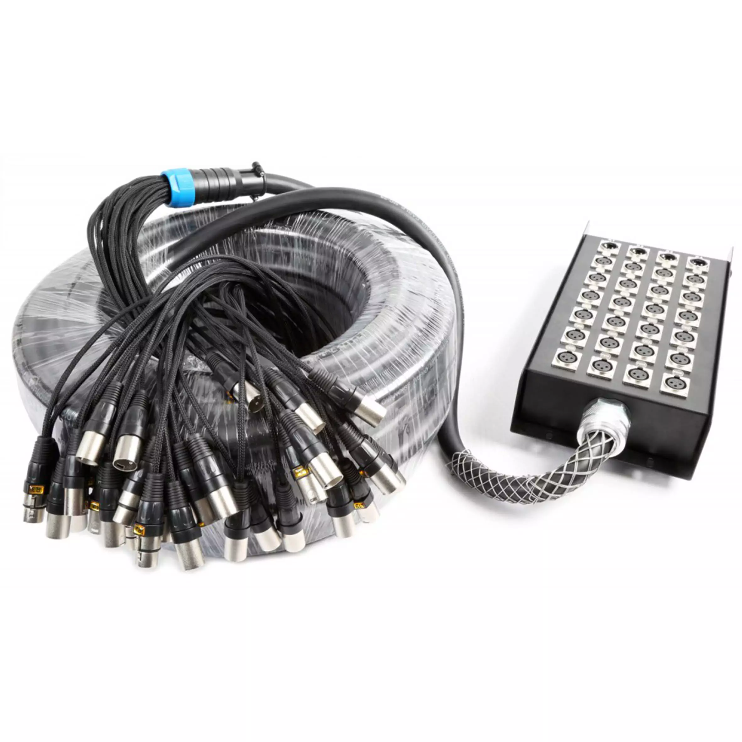 Stage Snake multi cable with a solid metal stagebox. The multi-cable has 24 inputs(female) and 4 outputs(male) on stagebox, allowing you to send microphone signals to the mixer and send out floor monitors back to the stage. The cable is 30 metres long and thanks to the high quality, you will able to enjoy it for years. Great for studio or live performances.