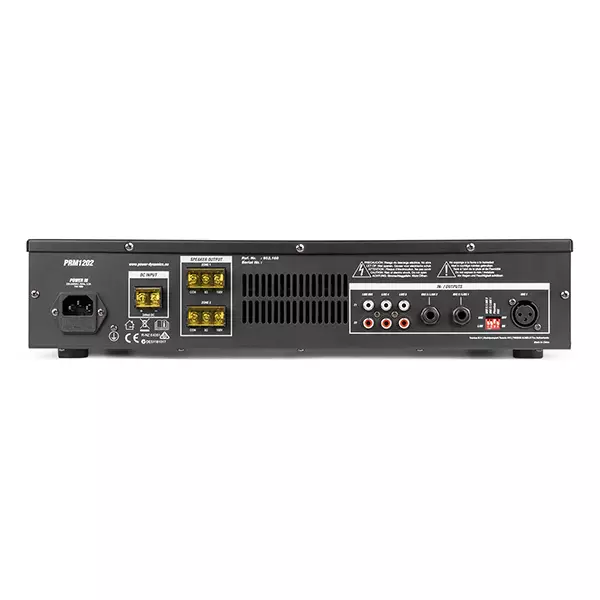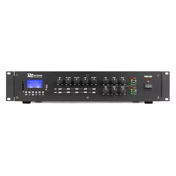 The PRM1202 is a rack-mountable amplifier with 2 separate 120W outputs that can either be used as 100V amplifier or as a standard low-impedance amplifier. This 2 zone amplifier is designed for multi-room systems requiring different audio sources. It’s equipped with BT receiver and USB/SD ports for MP3 playback including a bright LCD display with ID3 Tag. The PRM1202 is provided with switchable XLR inputs with 24V Phantom Power, especially for paging and condenser microphones. Especially designed for applications such as paging, announcements, intercommunications, background music, broadcasting in industrial plants etc.