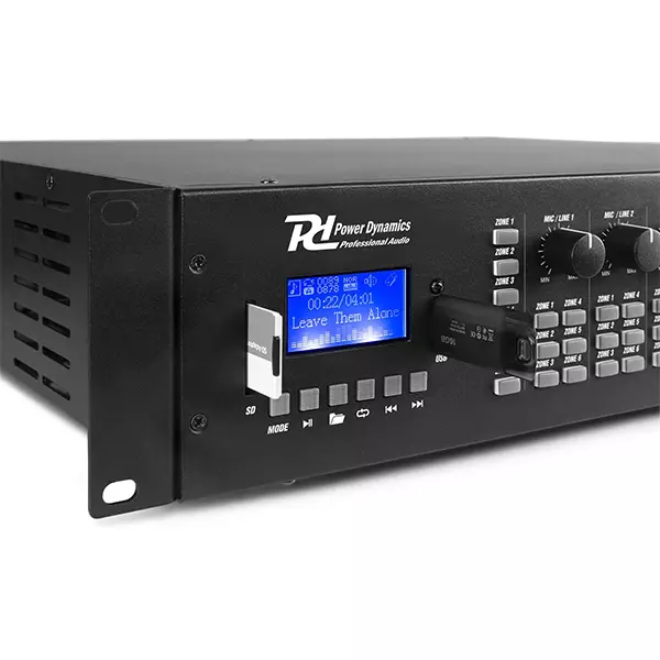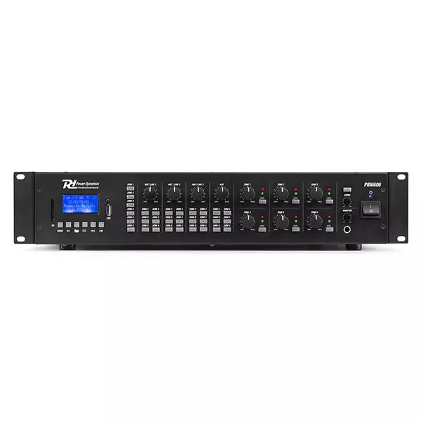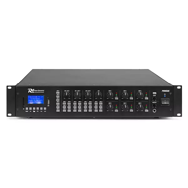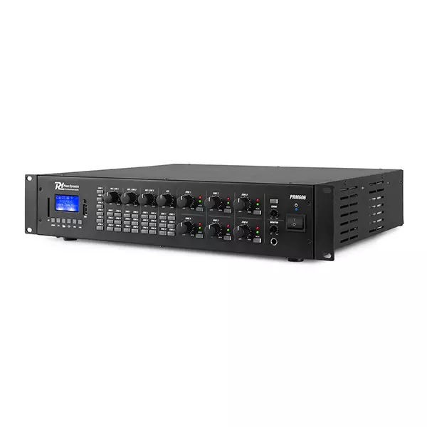 The PRM606 is a rack-mountable amplifier that can either be used as 100V amplifier or as a standard low-impedance amplifier. This 6 zone amplifier is designed for multi-room systems requiring different audio sources. It’s equipped with BT receiver and USB/SD ports for MP3 playback including a bright LCD display with ID3 Tag. The PRM606 is provided with switchable XLR inputs with 24V Phantom Power, especially for paging and condenser microphones. Especially designed for applications such as paging, announcements, intercommunications, background music, broadcasting in industrial plants etc.