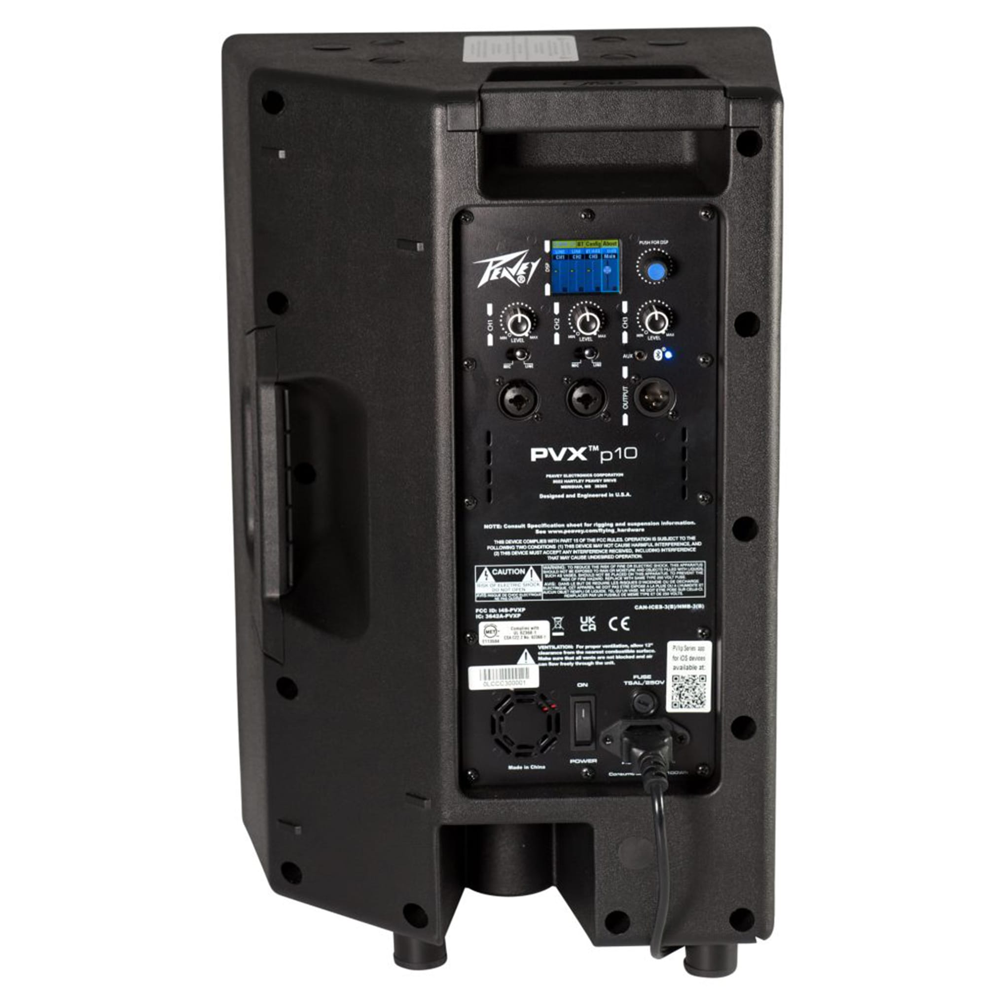 The PVXp 10 Bluetooth provides two channels with a balanced input via a combination jack that accepts balanced TRS 1/4 inch input as well as a balanced XLR input. A switch is provided to change between line level gain and mic level gain. A third channel is for a Bluetooth source, or alternatively a 1/8″ AUX input jack. Each channel has an adjustable Level control and a three-band EQ section. There is a balanced output, a Male XLR, that can feed the mixed signals from the three channels out to another component. A front baffle LED indicator that can be set to light when power is on, and when the “soft-limiting” DDT circuit is activated, or it can be turned off altogether. The LCD display and EQ presets, along with other DSP operating parameters are accessed via a one-knob selector.