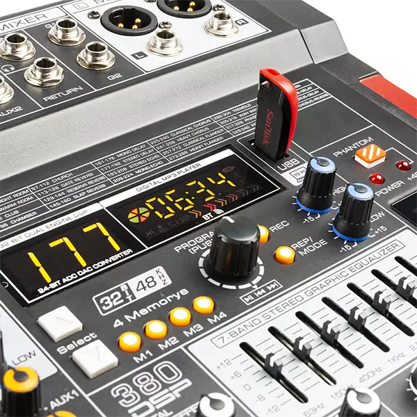 The PDM-T series is a series of stage mixers equipped with a 32-bit DSP effect processor, stereo 7-band graphic equalizer, BT streaming capability and USB input/output for easy connection to the computer for music recording, etc. It’s also possible to use the one click recording function for easy MP3 recordings on a USB stick. Each channel has its own gain control with treble, mid and bass controls. The microphone preamps offer selectable 48V phantom power on all microphone channels. The PDM-T mixers are designed to provide multi-channel mixing capabilities for bands, musicians, sound engineers, conferences, studio recording and a variety of other live stage applications.
