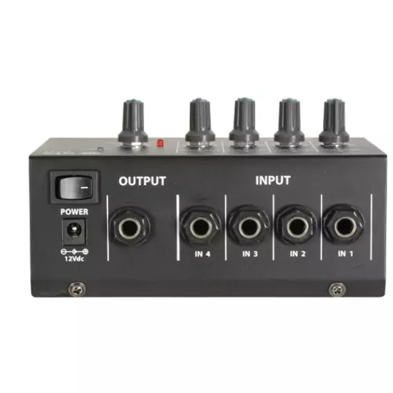 Compact mixers with high impedance jack inputs suitable for auxiliary line level or instruments, mixing to a master jack output. Available as either 4 mono or 4 stereo version with separate volume controls for each input and master output. Powered by 1 x 9V battery or optional 12Vdc adaptor