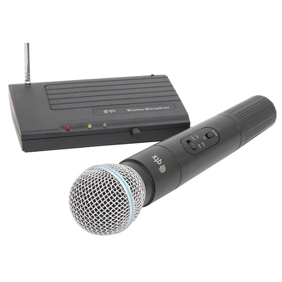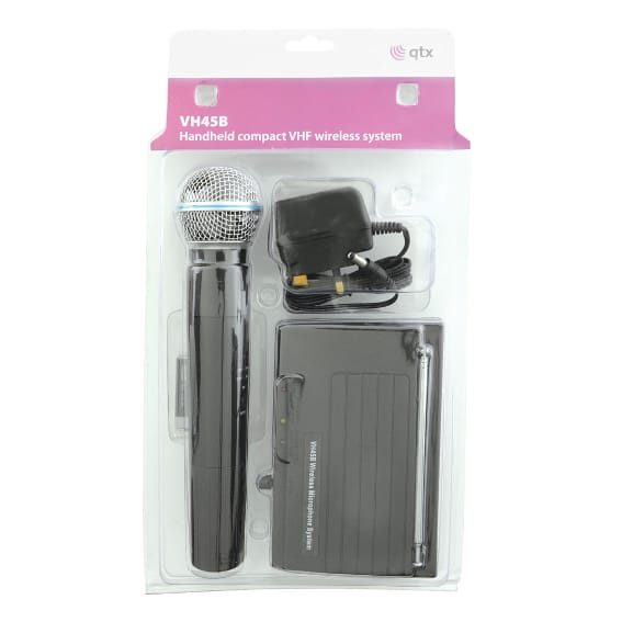 Handheld VHF wireless microphone with desktop receiver, supplied with power supply, batteries and signal lead.