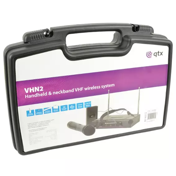 A dual channel VHF wireless microphone system with a half-width 1U receiver, 1 handheld transmitter and 1 beltpack transmitter with a neckband headset microphone.