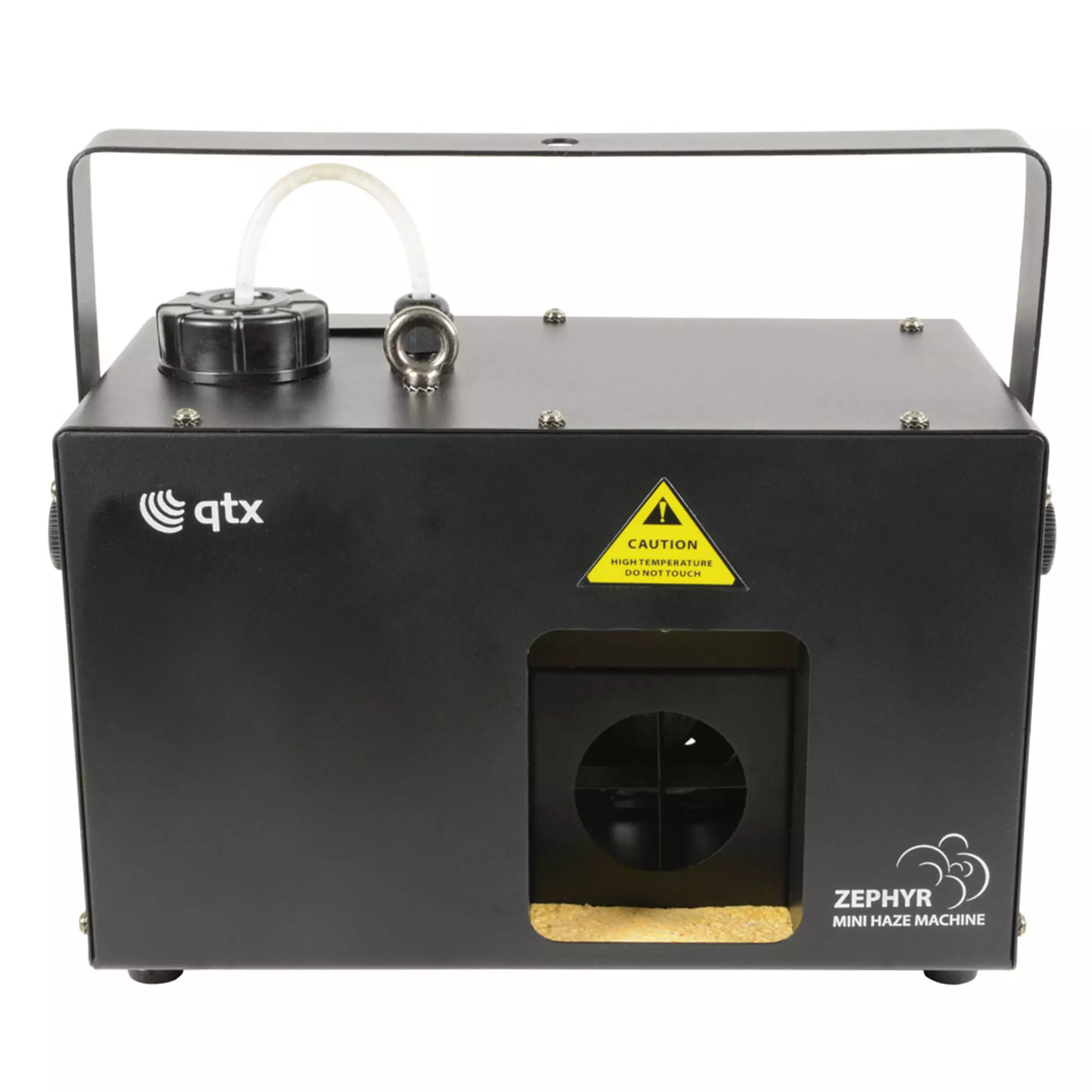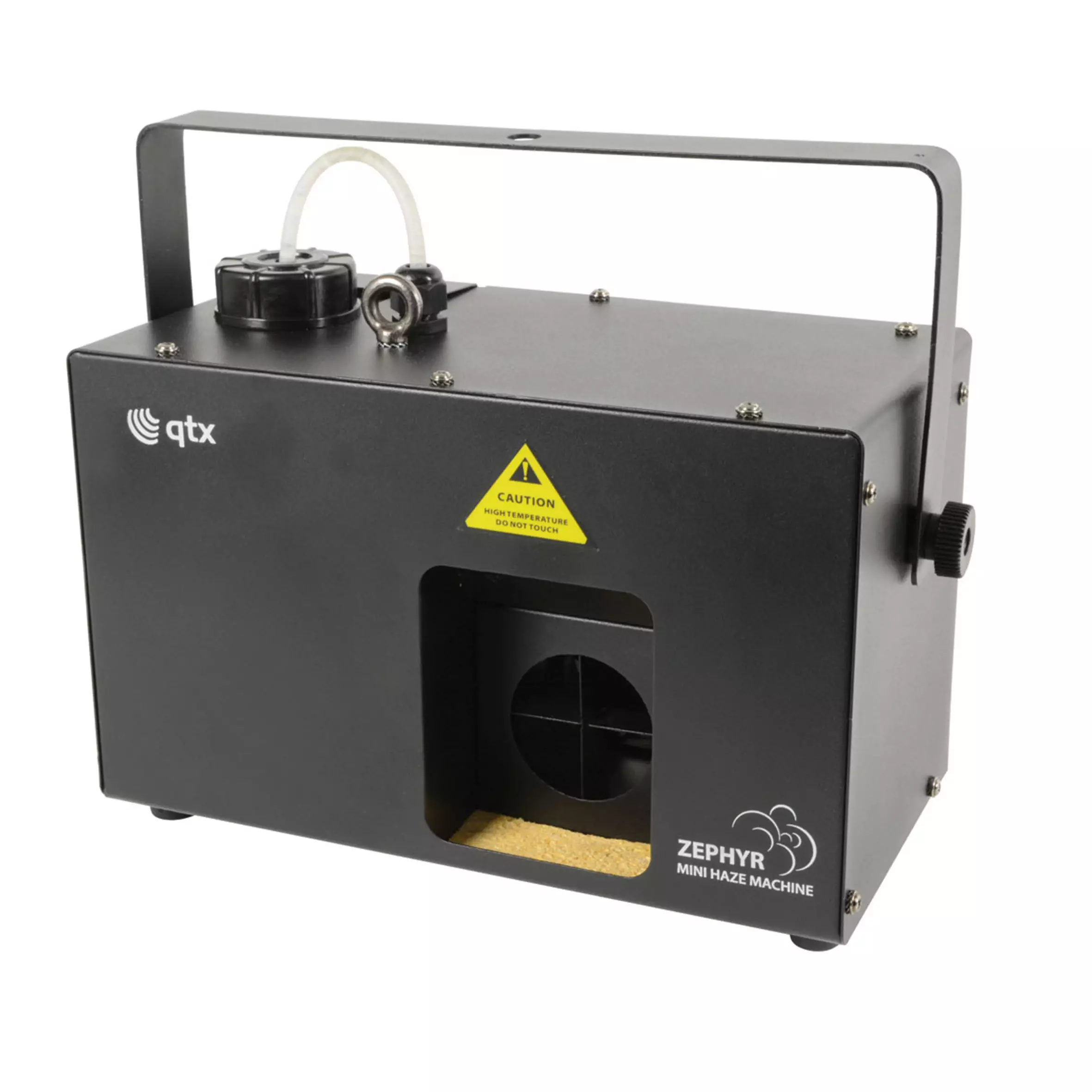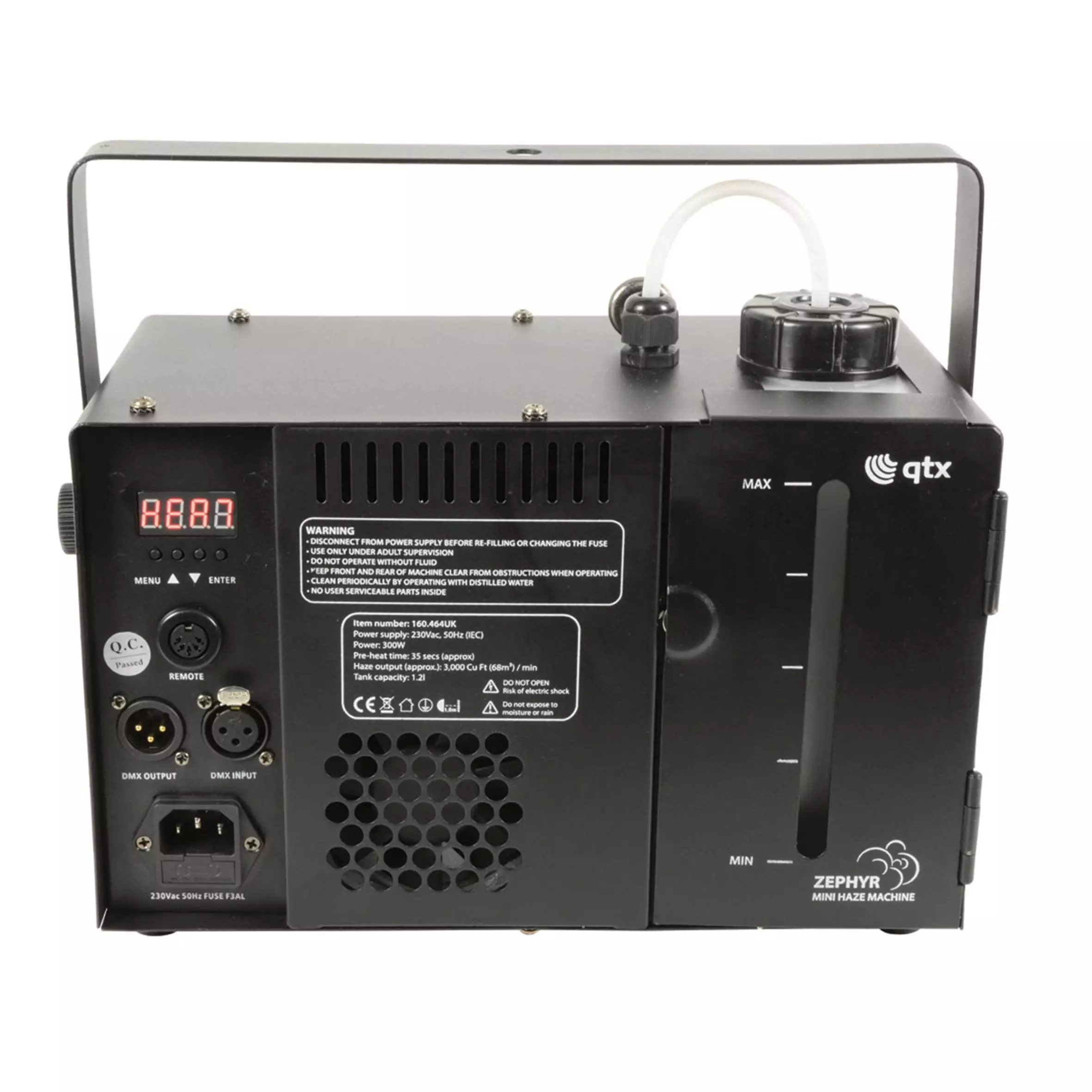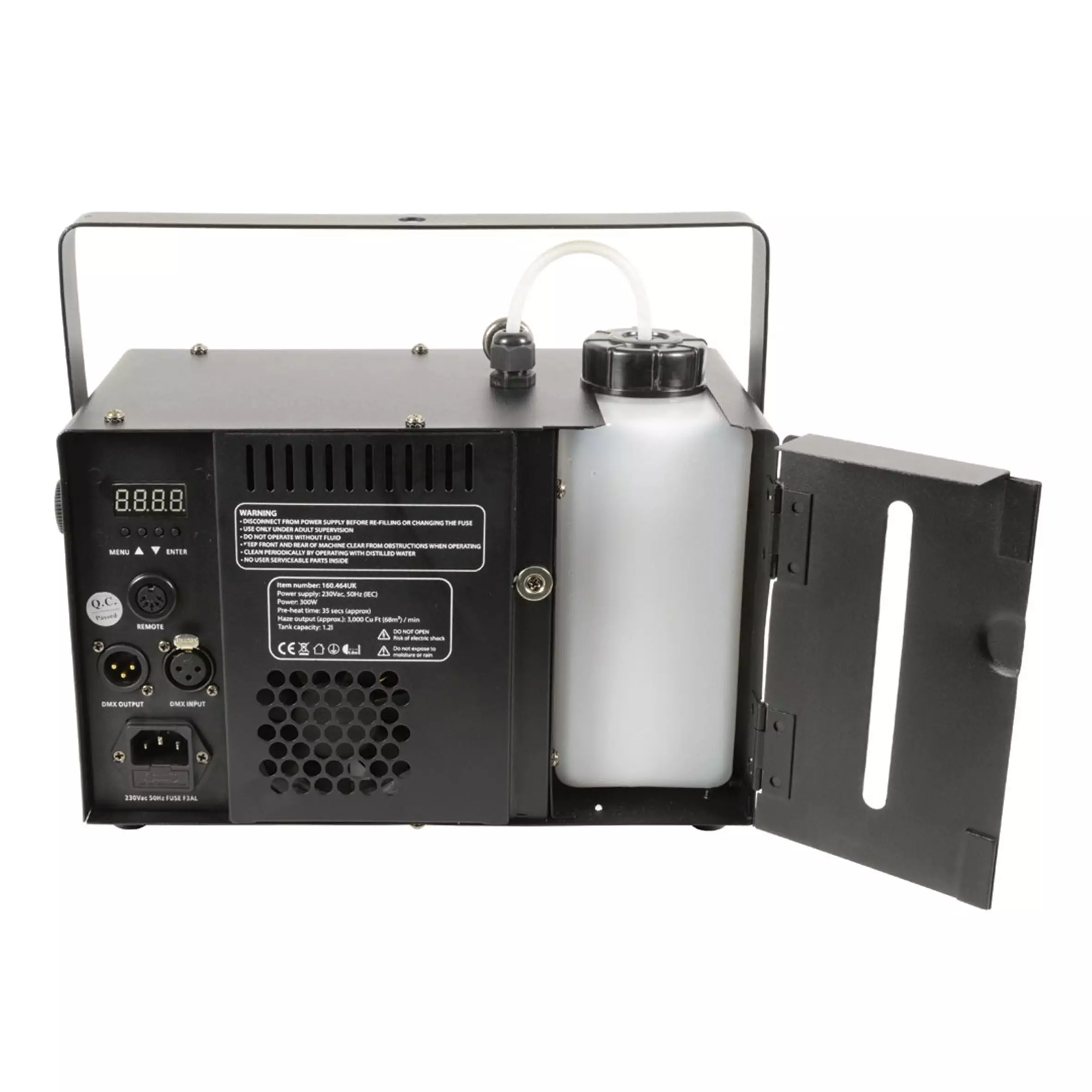 Digitally controlled haze machine with a sturdy metal housing for medium sized venues. Haze output can be set via the rear control panel and controlled from the included keyfob-style RF wireless remote or by DMX signal. A hinged door at the rear allows the fluid bottle to be removed for easy refilling and a slot window to show the fluid level. Designed to offer professional level haze effects in a compact format for easy installation and portability.