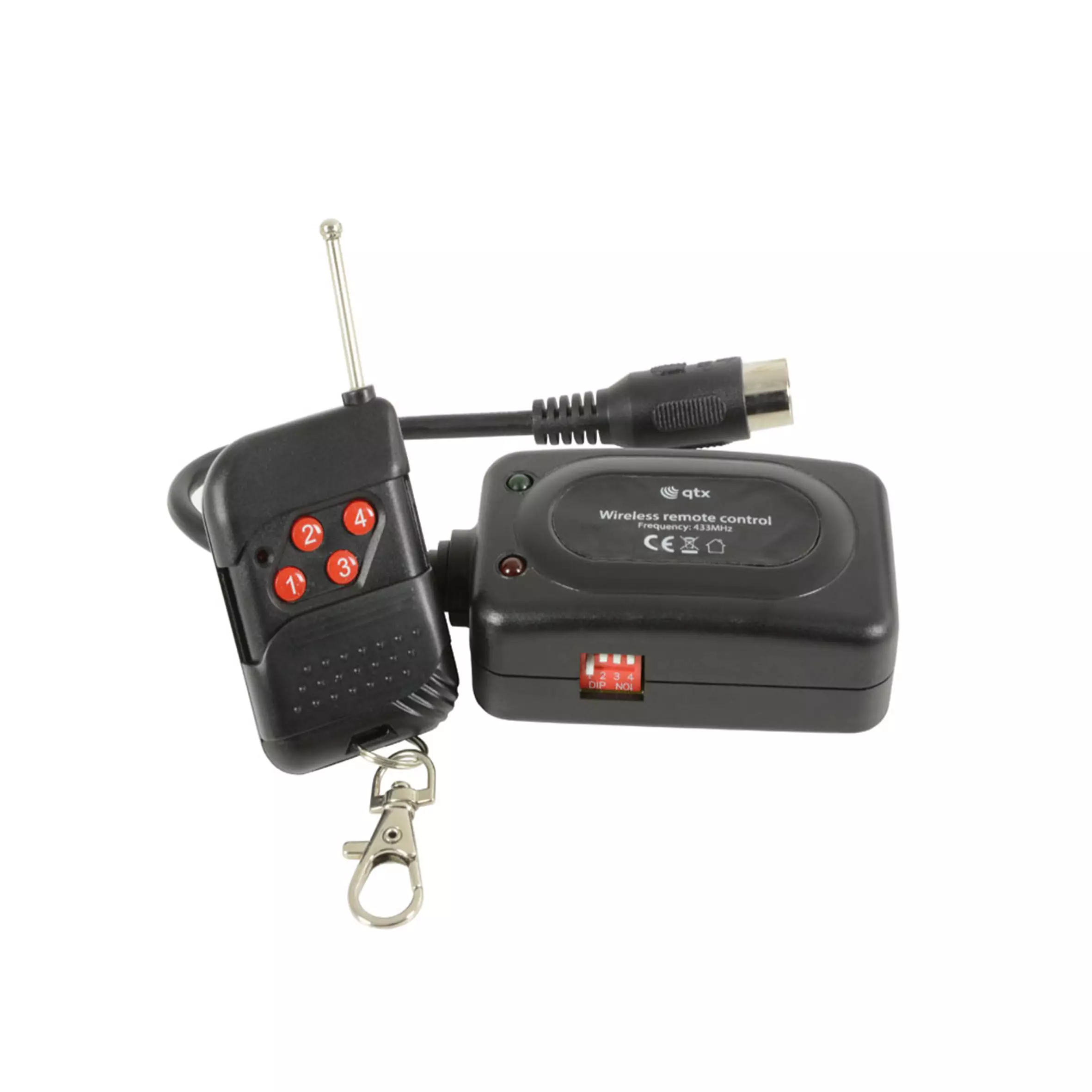 - Remote control: RF keyfob & receiver (5-pin DIN)