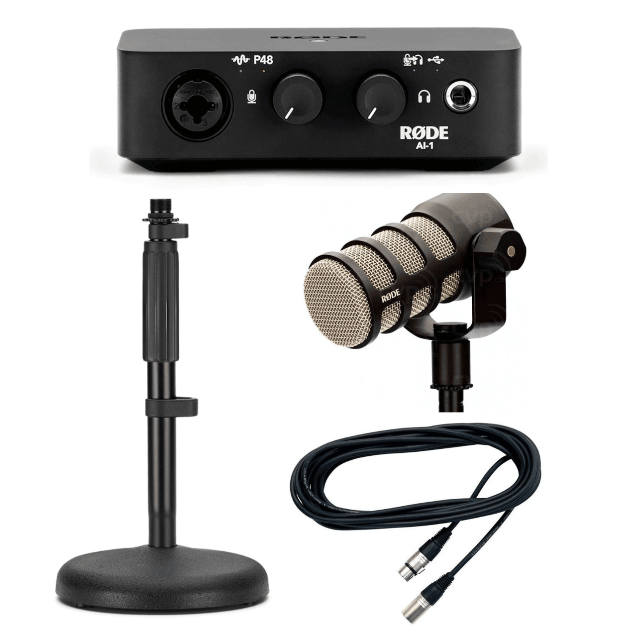 Bundle consisting of one (1) Rode PODMIC, one (1)  Rode AI-1 Interface, one (1) Rode DS1, and one (1) XLR 3m Microphone Cable