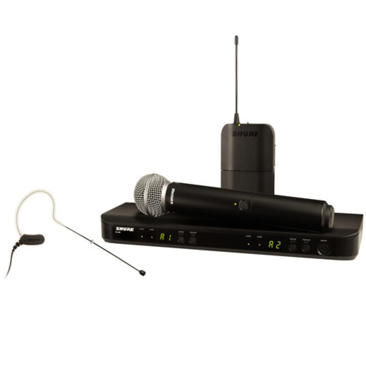 The Shure Microflex MX153 is a professional subminiature earset microphone ideal for speech and other applications requiring low-profile discreet placement where improved gain before feedback over lavalier microphones is desired. The SM58 is the industry standard microphone tailored to deliver warm and clear vocal reproduction. With analogue wireless dual transmission.