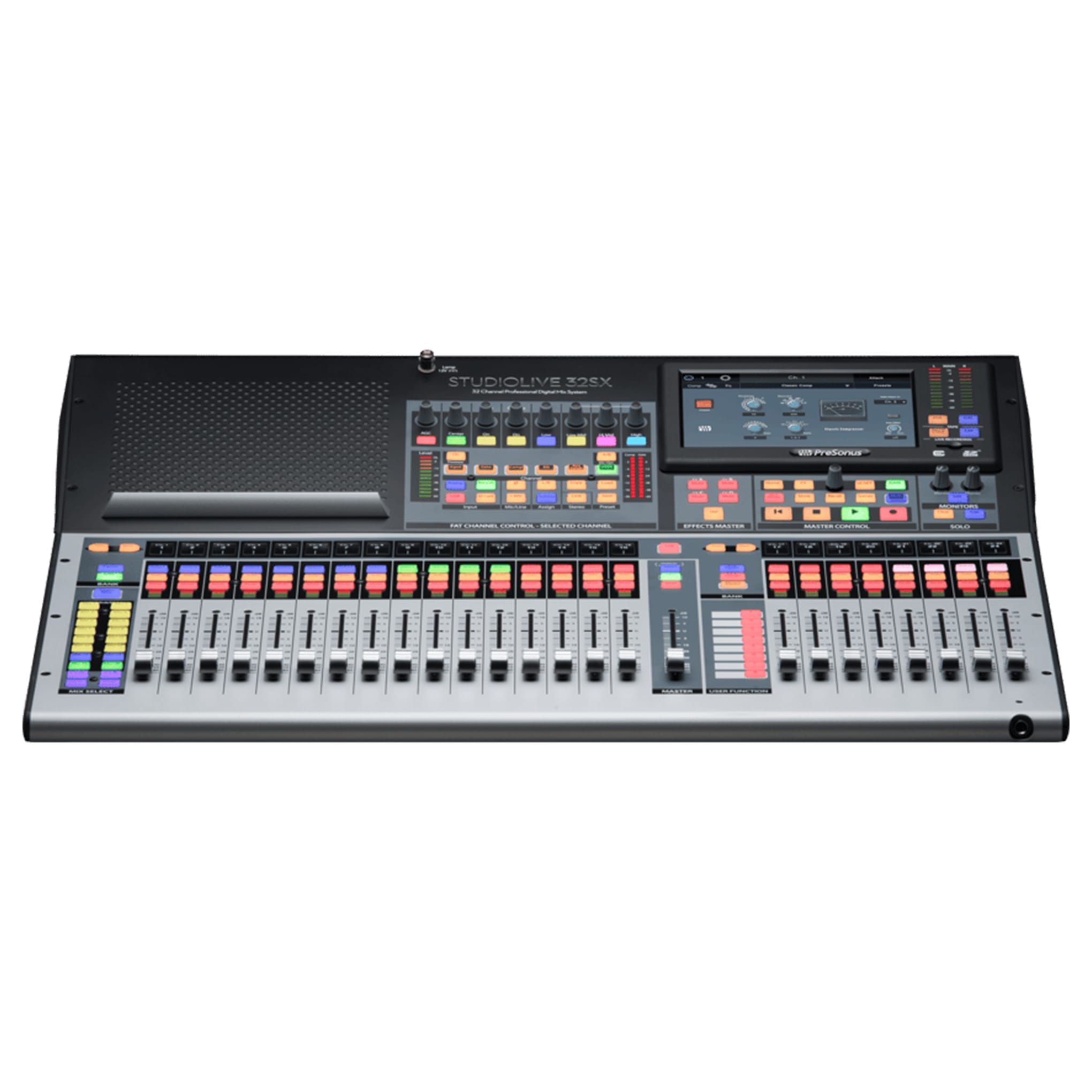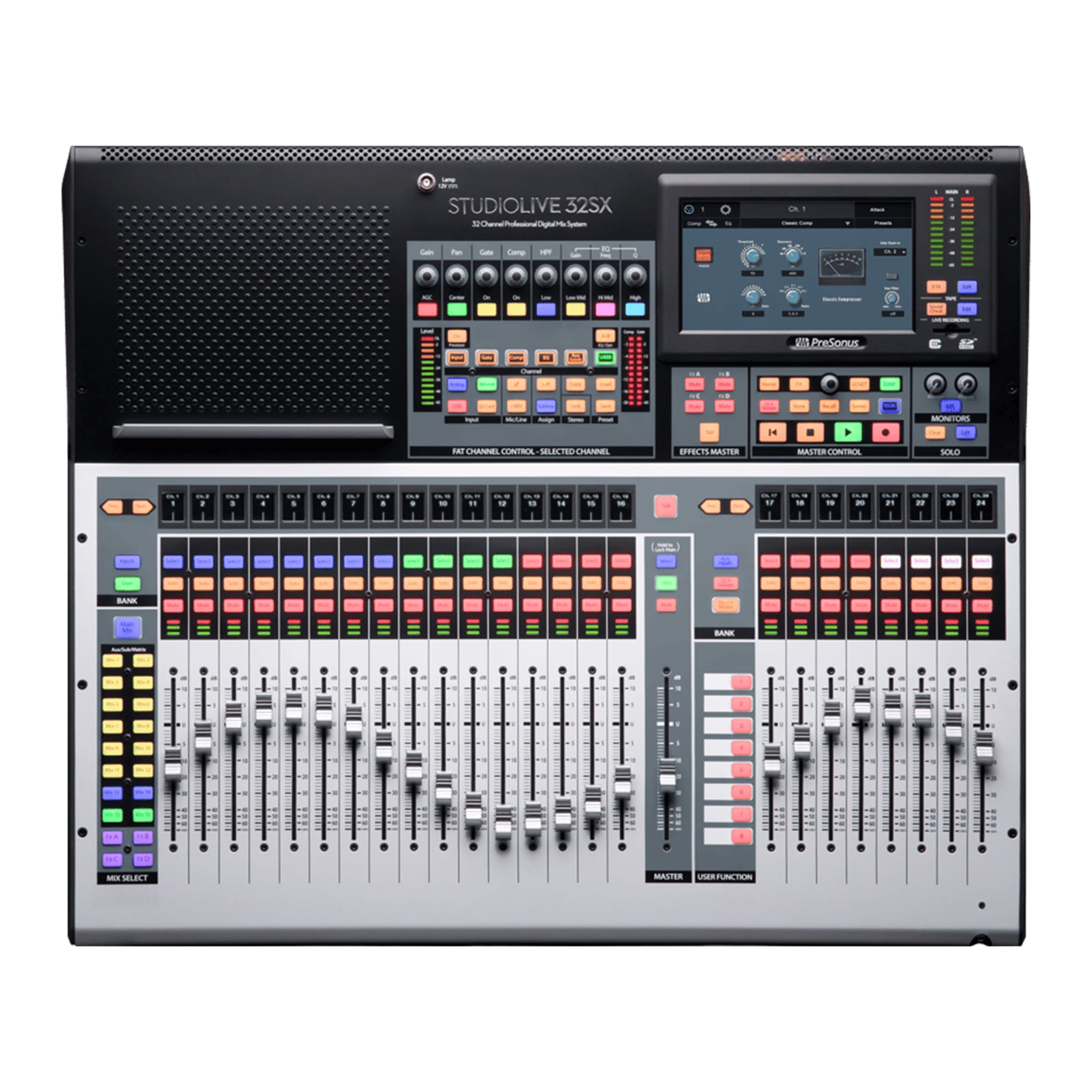The StudioLive® 32SX is a 40-channel digital mixer in a compact 25-fader chassis. Its split-fader workflow lets you control 32 inputs across two layers, with eight faders dedicated to mix outputs for quick access. With 16 FlexMixes configurable as auxes, subgroups, or matrix mixes, plus four effects buses and four subgroups, your routing options are nearly limitless. Manage groups easily with 24 DCAs. Fat Channel processing delivers vintage EQ, classic compressors, and more on every input and output.
