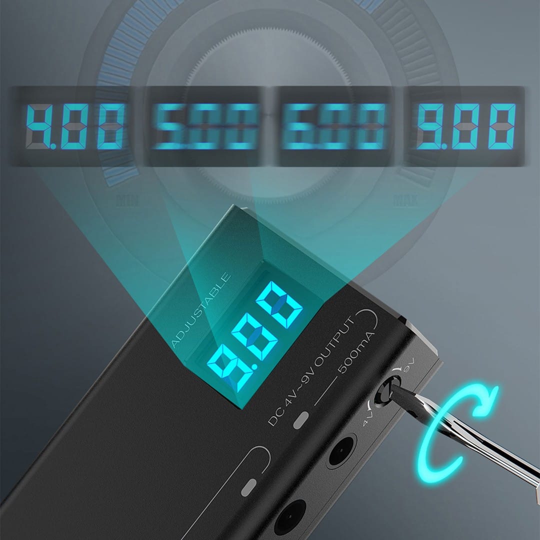 Outputs: Seven 9V DC 100mA, one adjustable 4V–9V DC 500mA, one 5V 1A USB