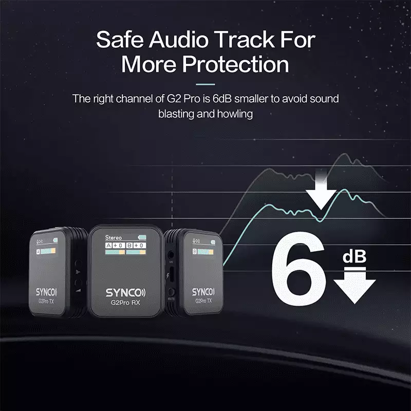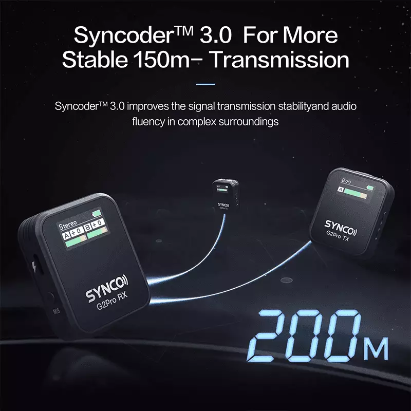 The Syncoder™ 4.0 encrypted transmission algorithm makes the G2 Pro a wireless microphone of 200m range. It delivers reliable transmission with clear sound at a line-of-sight distance up to 656′ (164′ with limited obstacles). Inbuilt with automatic reduction for typical noise like outdoor winds, traffics, you also have a one click option to reduce enhanced noise in real-time, saving the efforts of post editing the audio after recording.