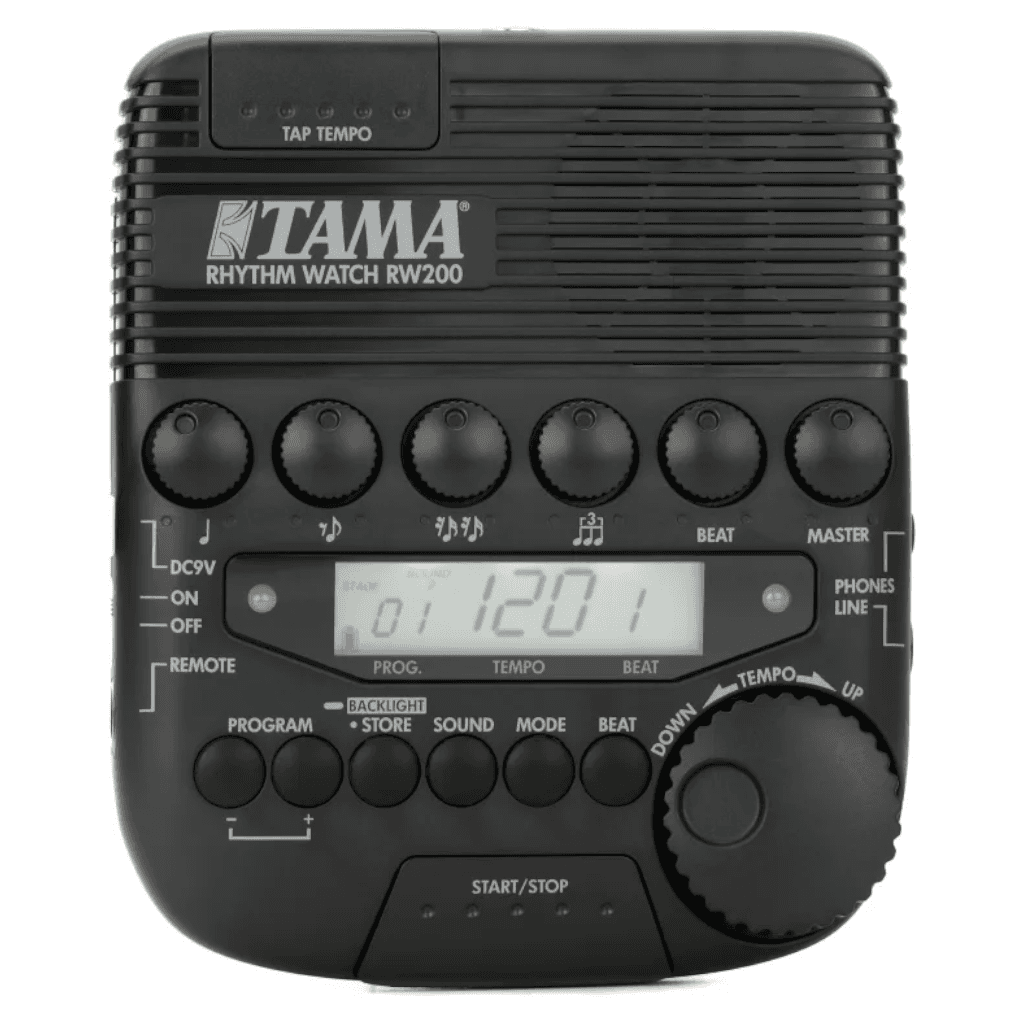 Tama packs every must-have tool you need into the RW200 and gives you the control you need to customize your beat-keeping. It’s great for practicing your chops when you’re on your own – and also for making sure you’re jamming at the right tempo on all of your band’s tracks. Store your favorite grooves into memory – the RW200 lets you store 30 different tempo/beats into memory for instant set recall, so you can get right into the groove. To avoid that stale, always-the-same metronome sound, you can also use separate volume controls to customize the way you hear the beat divisions. The start/tap button is easy to reach, even when the RW200 is mounted on your kit. The large, easy-to-see fly wheel lets you make fast tempo adjustments and scroll through your settings and the big and brightly backlit LCD display helps you keep an eye on it all!