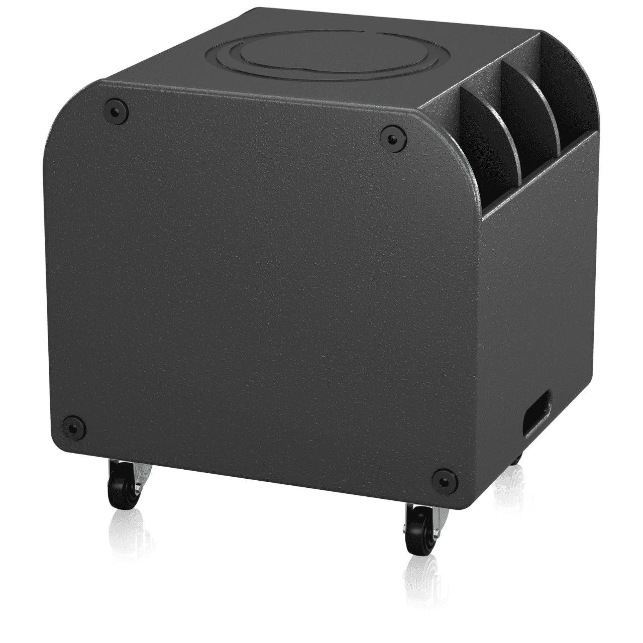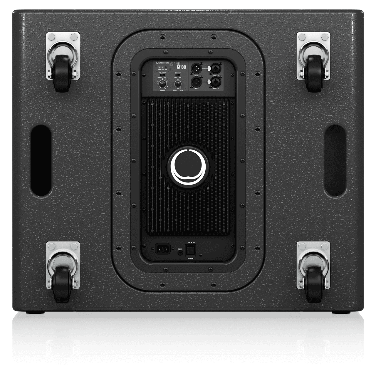 The M18B’s enclosure consists of solid birch plywood with a hard-wearing semi-matt black paint finish and is ribbed internally to eliminate resonances and minimize vibration. Plated steel castors with rubber tyres are provided for easy transport, and the standard pole-mount socket allows powered loudspeakers to be mounted, either vertically or raised higher and angled down to optimise audience coverage. Mains power is connected via a non-locking IEC socket with an integrated fuseholder. The illuminated front badge can be operated in one of three modes: permanently on; permanently off; or to indicate the action of limiting.