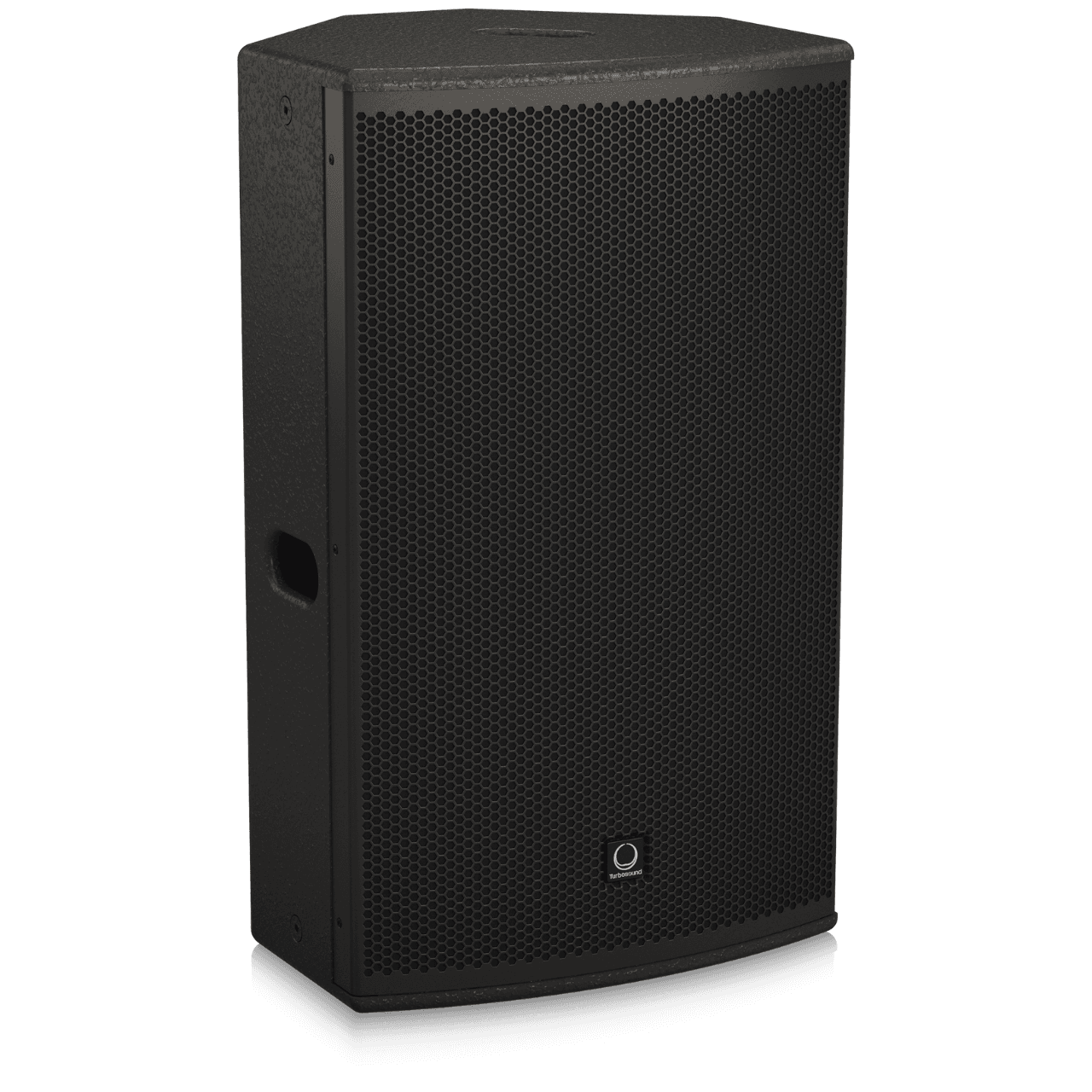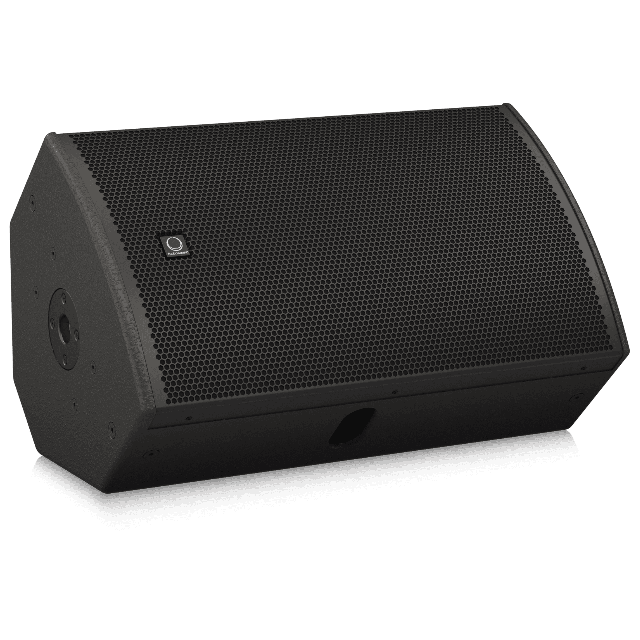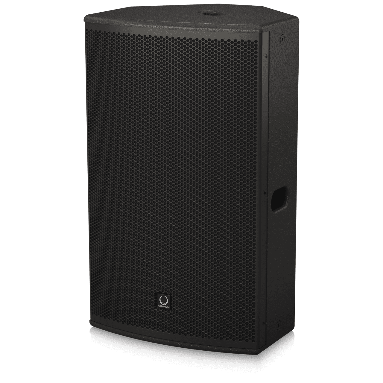 The loudspeaker shall be of the full range, two-way, powered type, consisting of one 15″ (394 mm) LF driver and one 1″ (25 mm) HF compression driver. Performance specifications of a typical production unit shall meet or exceed the following: frequency response, measured with swept sine wave input, shall be flat within ±3 dB from 55 Hz to 18 kHz and within -10 dB from 50 Hz to 20 kHz. Nominal dispersion, at -6 dB points, shall average 70° H x 70° V. Maximum amplifier output power shall be 2,500 Watts peak, independent of limiters and driver protection circuits. Maximum SPL (peak), measured at 1 metre with a music program, shall be 133 dB. Dimensions: 712 mm high x 430 mm wide x 385 mm deep (28″ x 16.9″ x 15.2″). Net weight: 23.6 kg (52.0 lbs). The loudspeaker system shall be the Turbosound NuQ152-AN. No other loudspeaker shall be acceptable unless submitted data from an independent test laboratory verifies that the above-combined performance/size specifications are equalled or exceeded.
