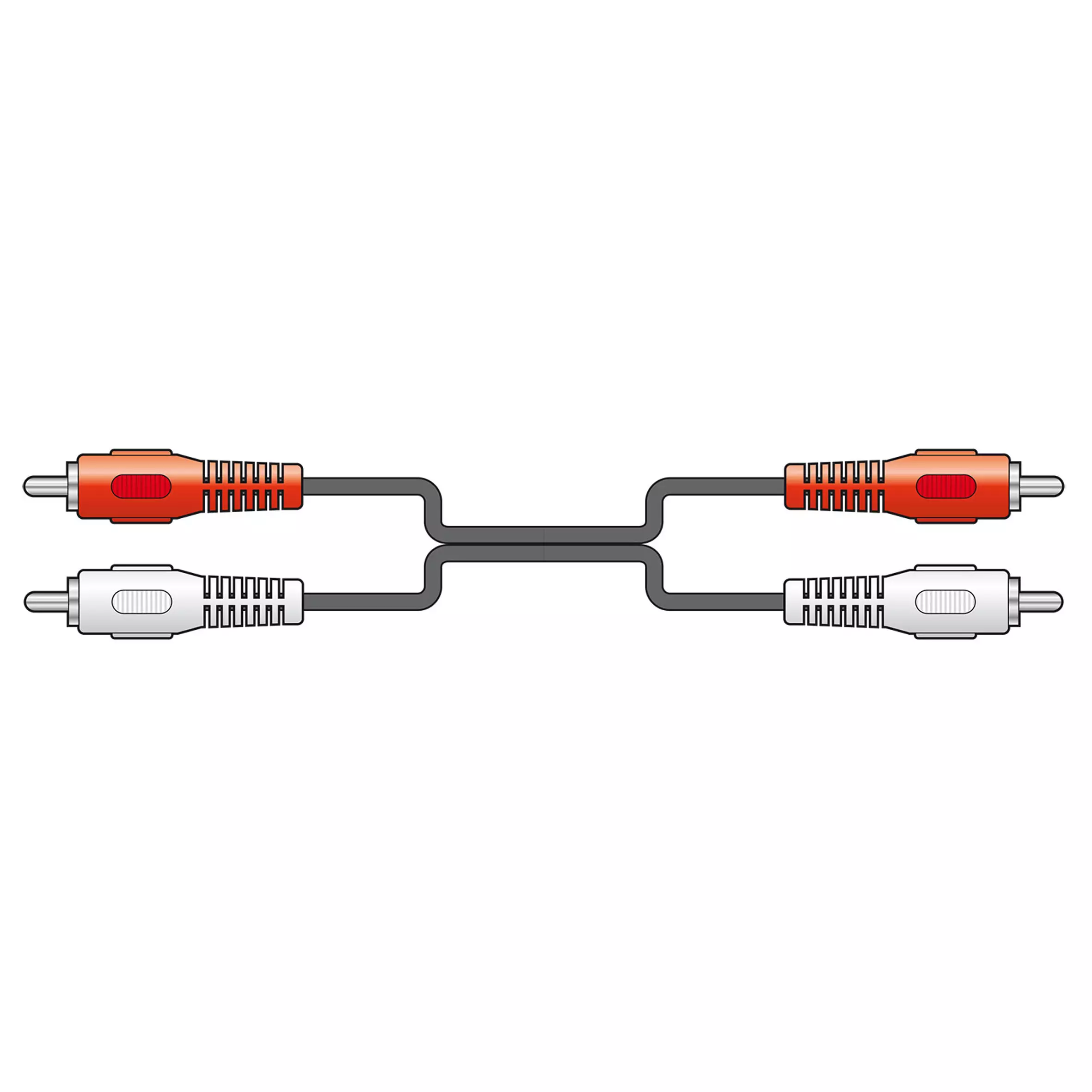 Standard two RCA phono plugs to two RCA phono plugs with 2.6mmØ screened twin audio cable, colour coded for stereo connection.