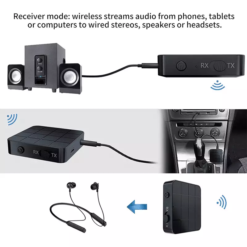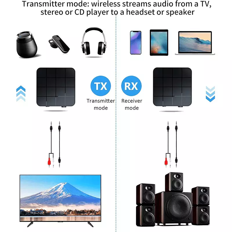 - In transmitter mode, audio from a non bluetooth TV, stereo or CD player to a bluetooth headset or speaker, in receiver mode, wireless audio from bluetooth enabled phones, tablets or computers to wired stereos, speakers or headsets