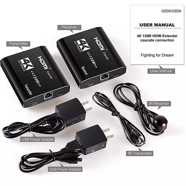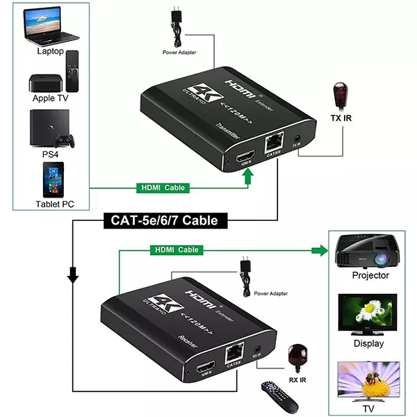 The extender uses single cat-5E or cat-6 (recommended) cables instead of HDMI cable to transmit high definition signal up to 120m. It is designed to supply long distance transmission of high definition signal. A solutions for noise, space and security concerns, data center control, information distribution, conference room presentation, school and corporate training environments.