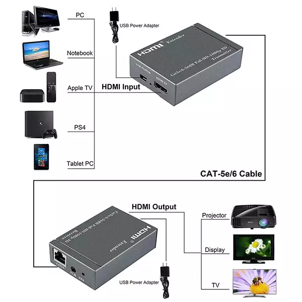 - Signal transmission: By using single cat-5e or cat-6(recommended) cable instead of HDMI cable, it can extend the distance up to