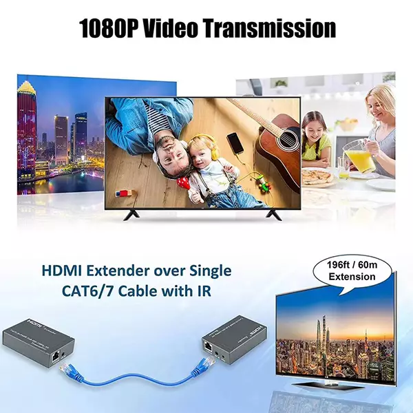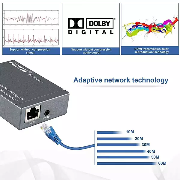 The extender uses single cat-5E or cat-6 (recommended) cables instead of HDMI cable to transmit high definition signal up to 60m, cutting down the cost. It is designed to supply long distance transmission of high definition signal. A solutions for noise, space and security concerns, data center control, information distribution, conference room presentation, school and corporate training environments.