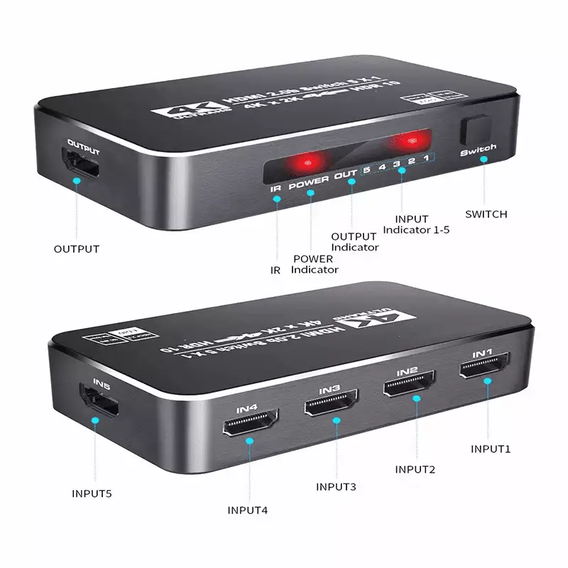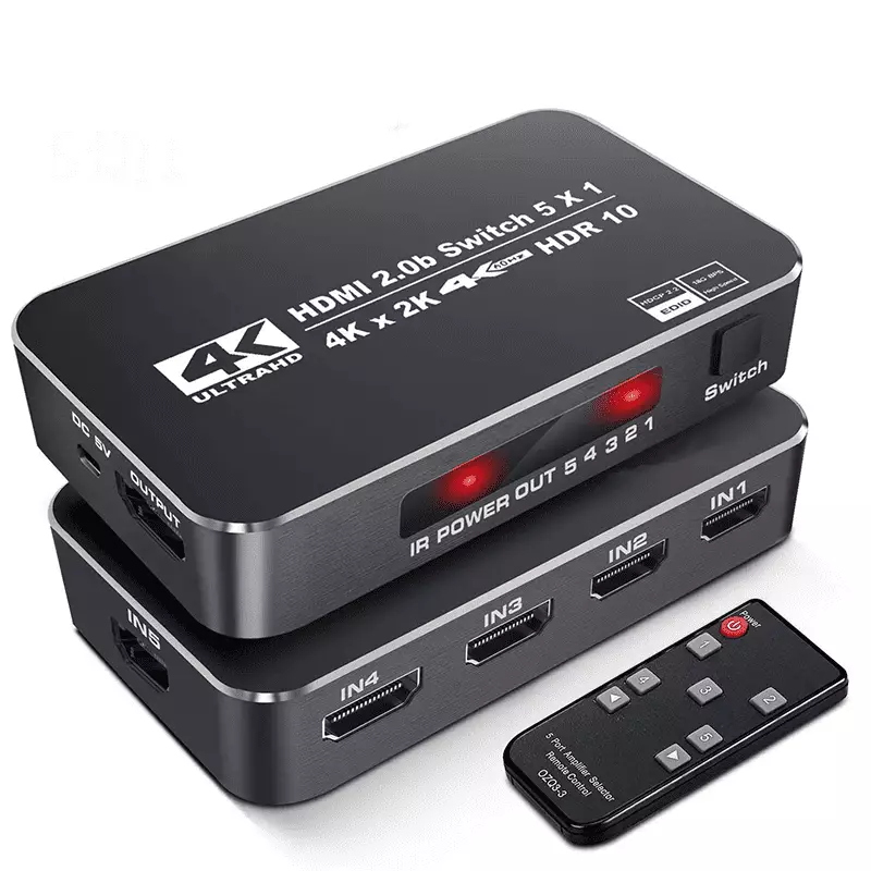 The 5-port HDMI switch supports HDR10 and HDCP 2.2 (backward compatible with HDCP 1.4 and 1.3). It also supports HDMI 2.0b (RGB 4:4:4) and deep color with 36 bits per channel. With a resolution of 4K at 60Hz, it accommodates various devices such as Amazon Fire Stick, Apple TV, gaming consoles, laptops, and more. It features an auto-switch function with remote control, seamlessly transitioning between HDMI sources. Additionally, it ensures Ultra HD resolution, supporting 4K x 2K at 60Hz, Full HD, Full 3D, and various other formats for a superior viewing experience.