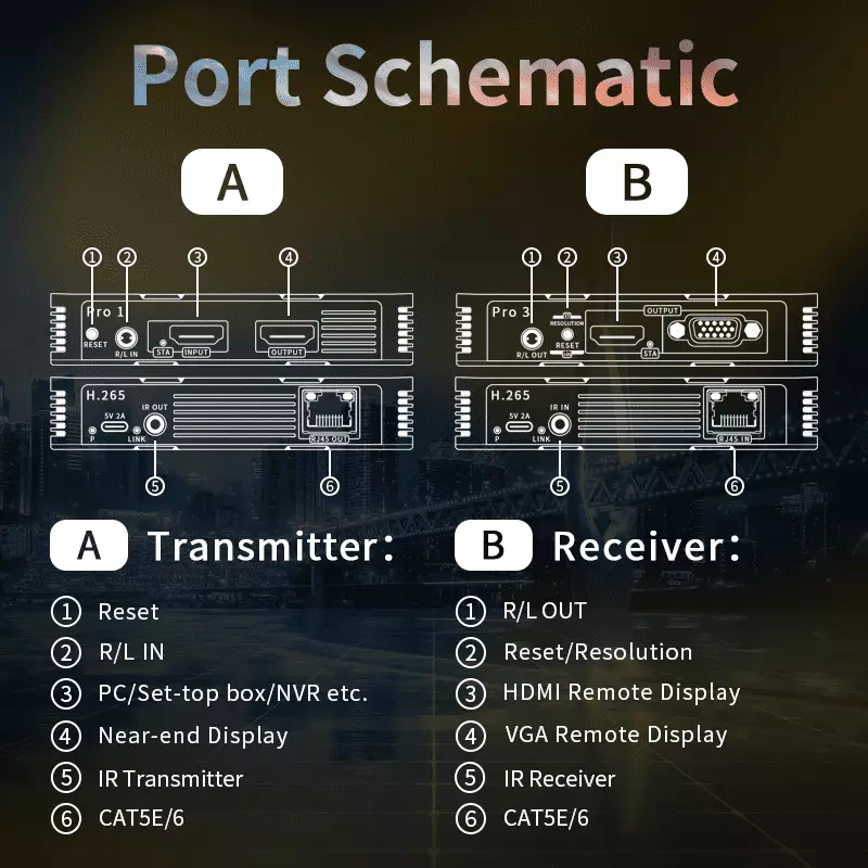 The Pro1 is 1080P@60Hz FULL HD transmitter It is a standard H.265/H.264 codec TCP/IP HD transmission product, this main feature is that the same RX with different TX can be used in 1080P/4K@30Hz and other application scenarios! In addition to supporting HDMI audio and video transmission, this product also has a TX local Loopout, remote KM keypad and IR back control, 3.5mm audio input, output and other features for users to choose.