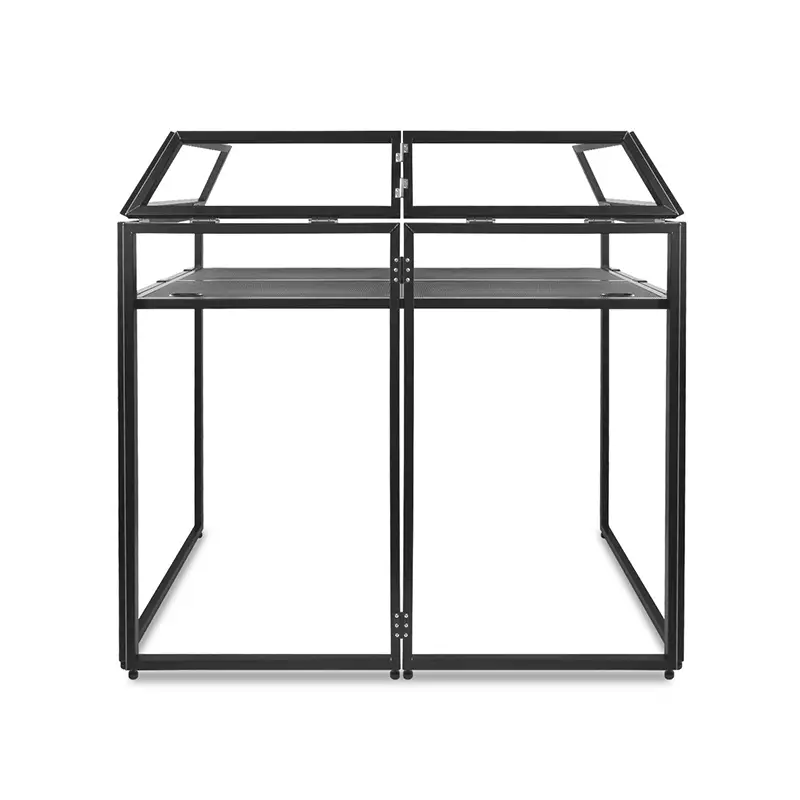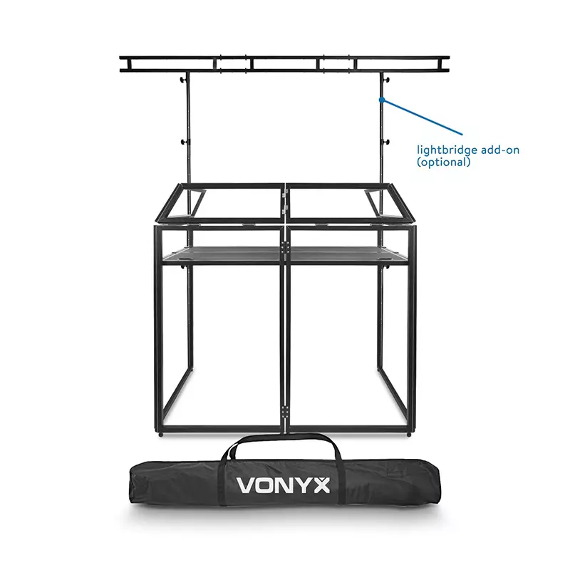 Complete professional DJ Booth system, including heavy-duty DJ-desk. Including carry-bags for easy transport and storage.