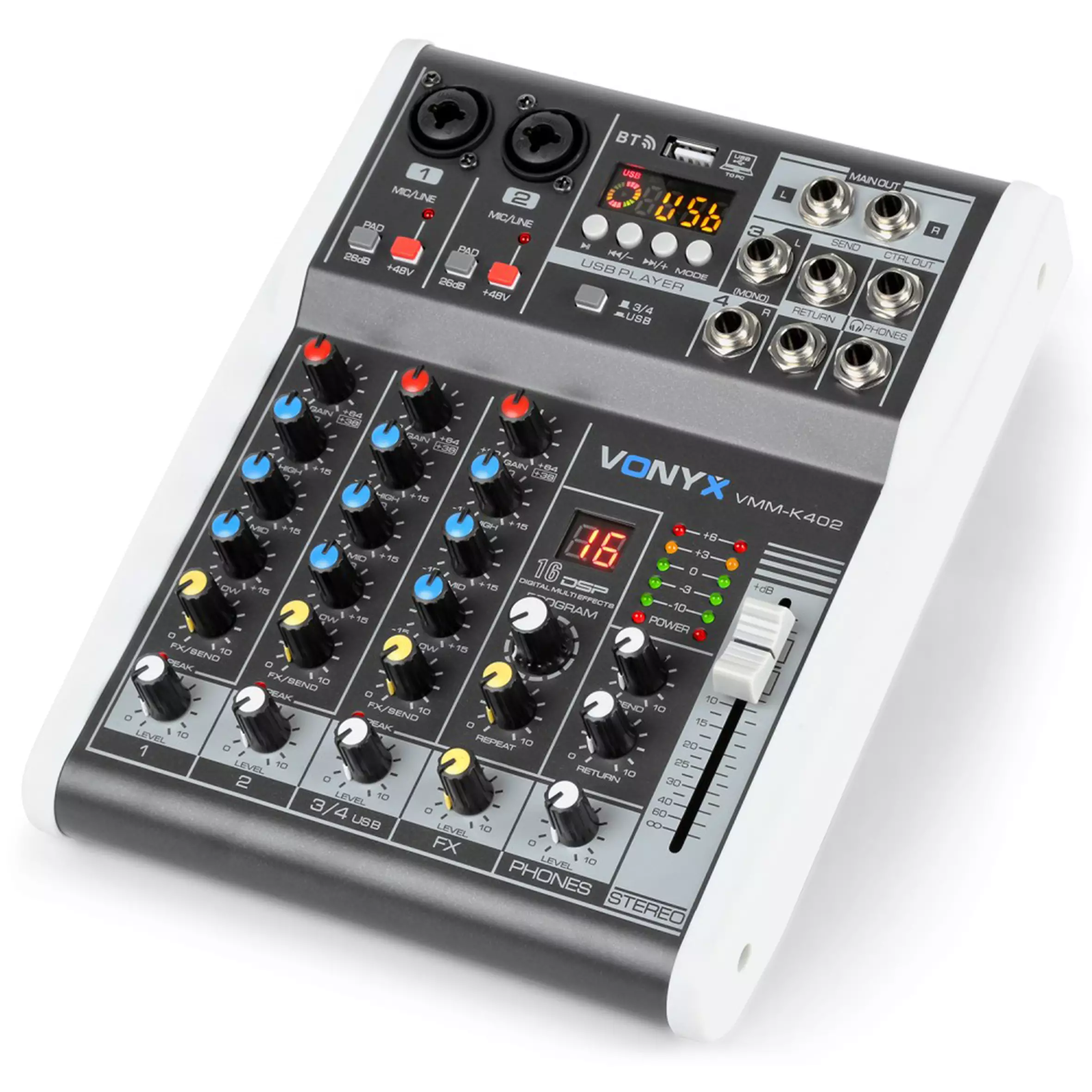 An easy to use and affordable table top design music mixer. With Hi, Mid and Low control for each channel. Individually controllable phantom power per channel making it ideal for live sound and recording purposes.