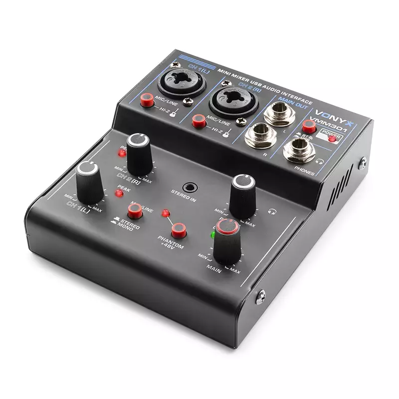 The VMM series is a range of compact music mixers with an USB audio interface that converts analogue signals from an audio source to USB audio. These small portable mixers are equipped with XLR combo Jack inputs (XLR + 6.3mm) that can support microphone or line signals, allowing you to connect your favourite microphone or instrument. These inputs also feature 48V Phantom power for connecting condenser microphones. The mixers from this series are all USB powered, no external power supply needed when used with a computer.