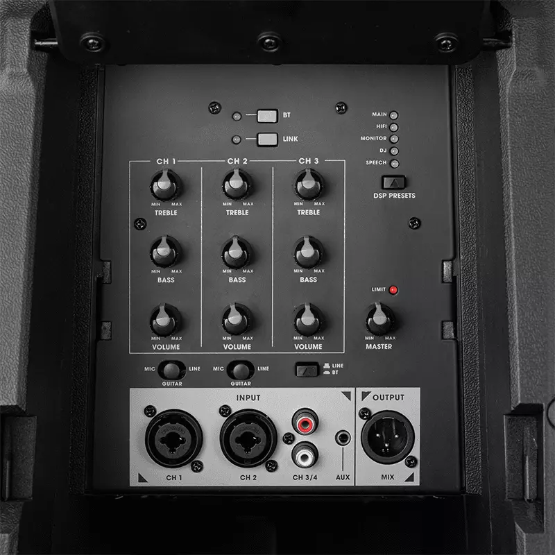 The Vonyx VX820 is a compact Plug and Play column system that delivers a powerful, high-quality sound and optimized dispersion. Thanks to its BT 5.0 capability, the VX820 allows you to effortlessly connect your devices and stream music wirelessly. Whether you’re streaming music from your phone or giving a presentation, this speaker system will have you covered. The VX820 is lightweight and also features a DSP, an Aux in, a Class-D amplifier and last but not least a 4-channel mixer for direct use. Designed for maximum portability, the VX820 has a unique storage system: the three columns fit exactly in the built-in compartment at the back. So, easy to carry and set up is fast and easy!