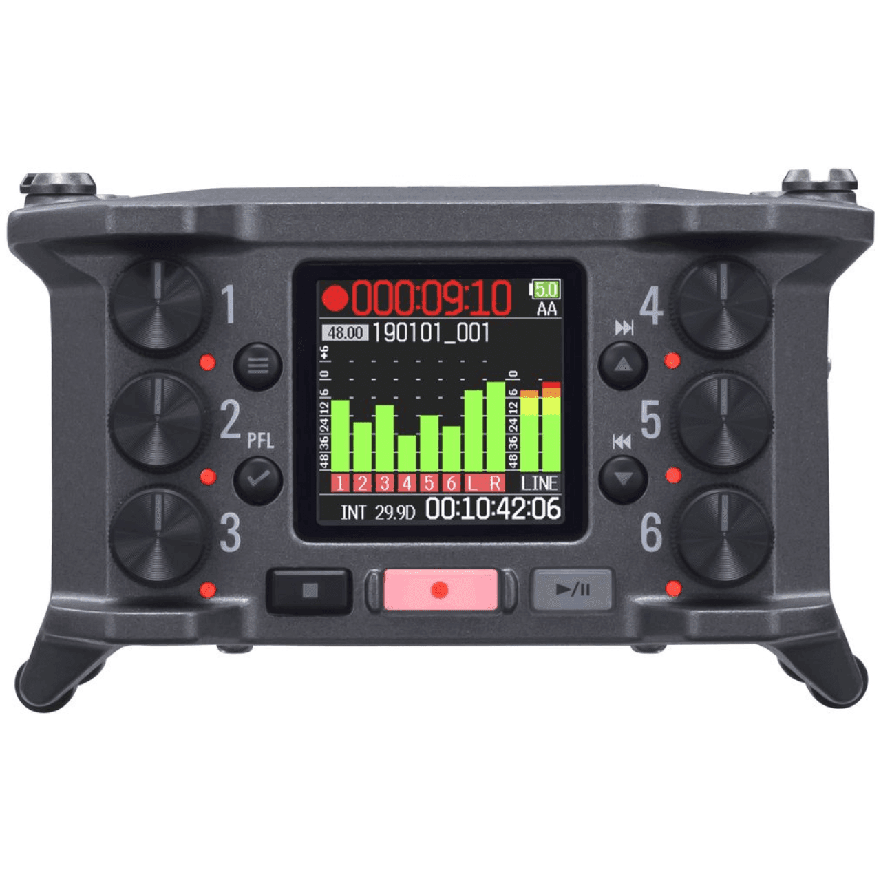 The F6 is equipped with six professional-grade preamps. Featuring a super-low noise floor (-127 dBu EIN), high gain (up to 75 dB), and selectable mic/line levels for each input, the F6 is built for location sound.